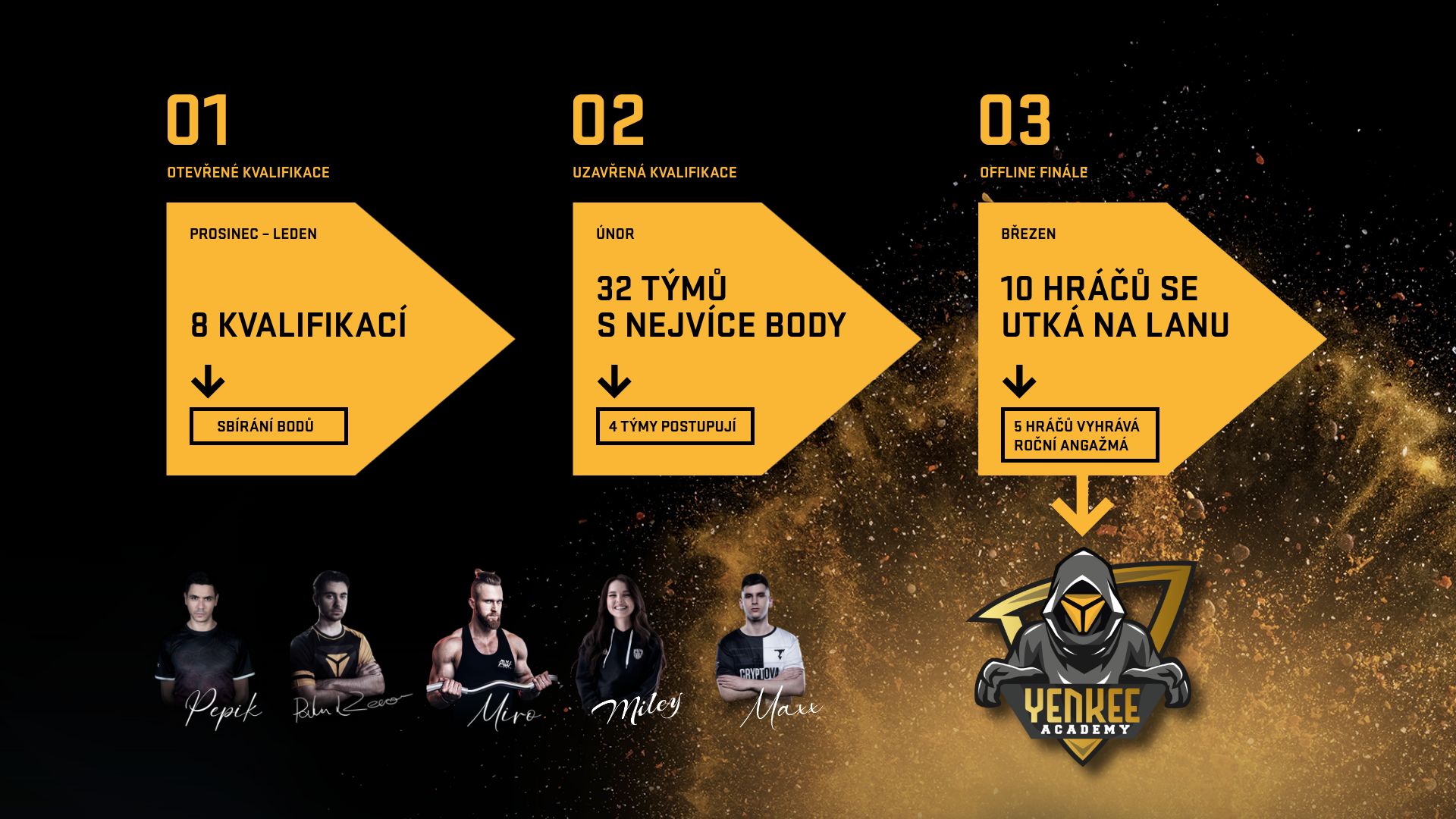 A: Yenkee Akademie je určena pro hráče ve věku 14 - 18 let, Čechy a Slováky. Pokud nejsi Čech ani Slovák ale bydlíš na našem území a mluvíš naší řečí, tak i tobě je akademie otevřena