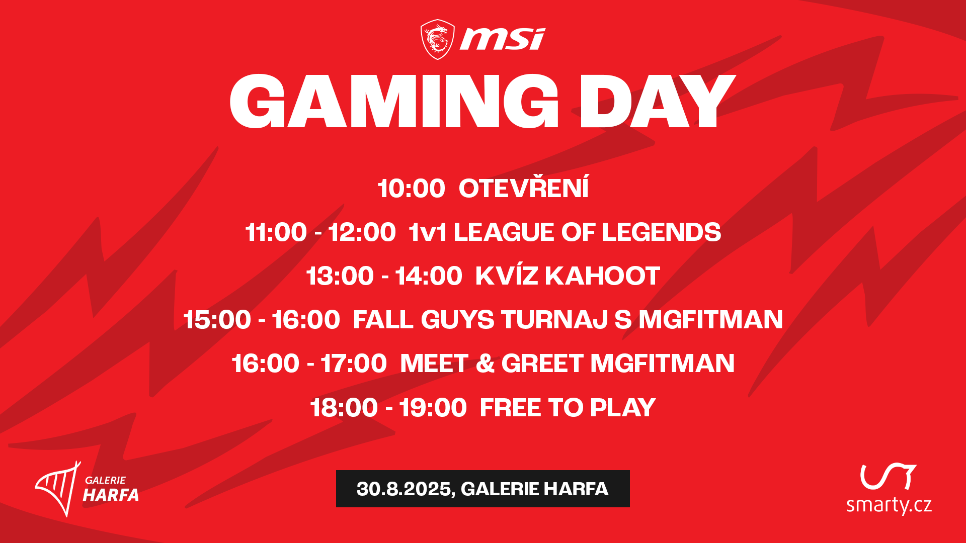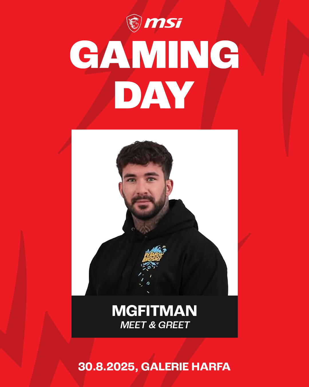 Konec prázdnin bude ve znamení gamingu! Do OC Harfa v Praze přichází MSI Gaming Day, jehož součástí bude tvůj oblíbený streamer MGFitman. Kdy? 30.8.2025.