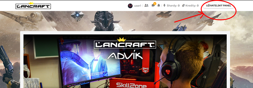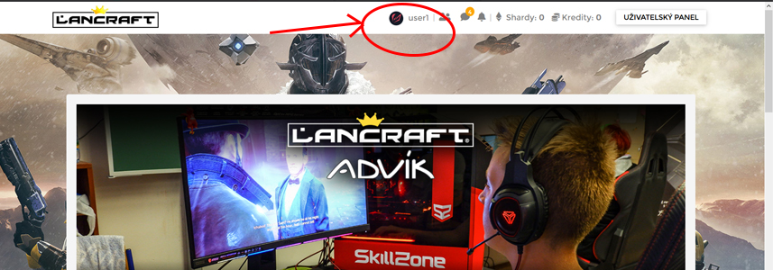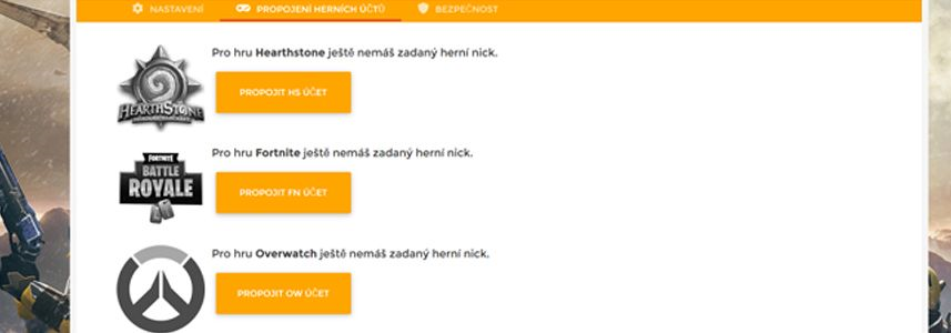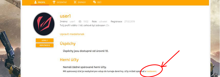 - Po dokončení registrace vašeho účtu je potřeba ve svém profilu vyplnit herní účet. Toho dosáhnete kliknutím na název vašeho účtu (váš nick) a následně kliknutím na položku nastavení.