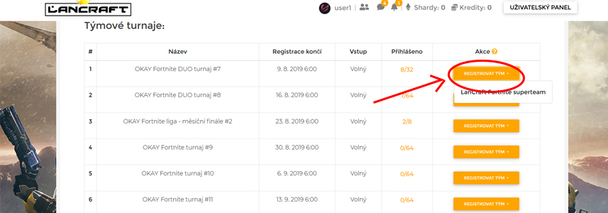 - Gratulujeme! Tým máte vytvořený. Následuje výběr turnajů, kterých se chcete zúčastnit. Na hlavní stránce našeho portálu zascrollujete dolů k seznamu turnajů a vyberete si, kterého se chcete zúčastnit.