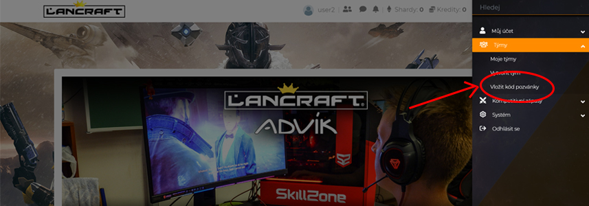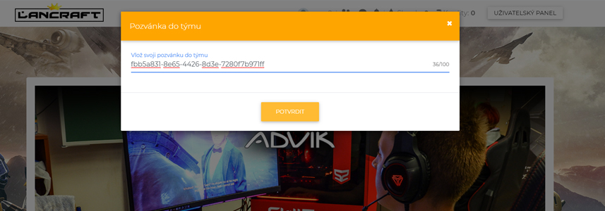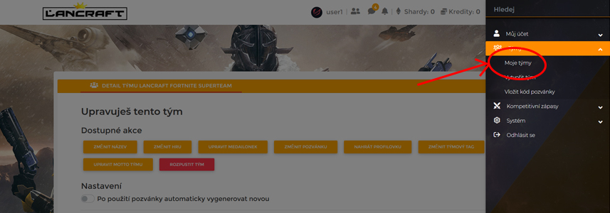 - Stránka vás přesměruje na profil vašeho týmu, kde zvolíte možnost Upravit a následně najdete Klíč pozvánky do vašeho týmu. Ten váš spoluhráč zadá v Uživatelském panelu, na kartě Týmy, v položce Vložit kód pozvánky, čímž se přidá do vašeho týmu.