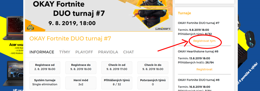 - DŮLEŽITÉ - Nezapomeňte na CHECK-IN (potvrzení účasti), který se spouští hodinu před začátkem turnaje, tedy v 17:00, čímž potvrdíte svou účast v turnaji.