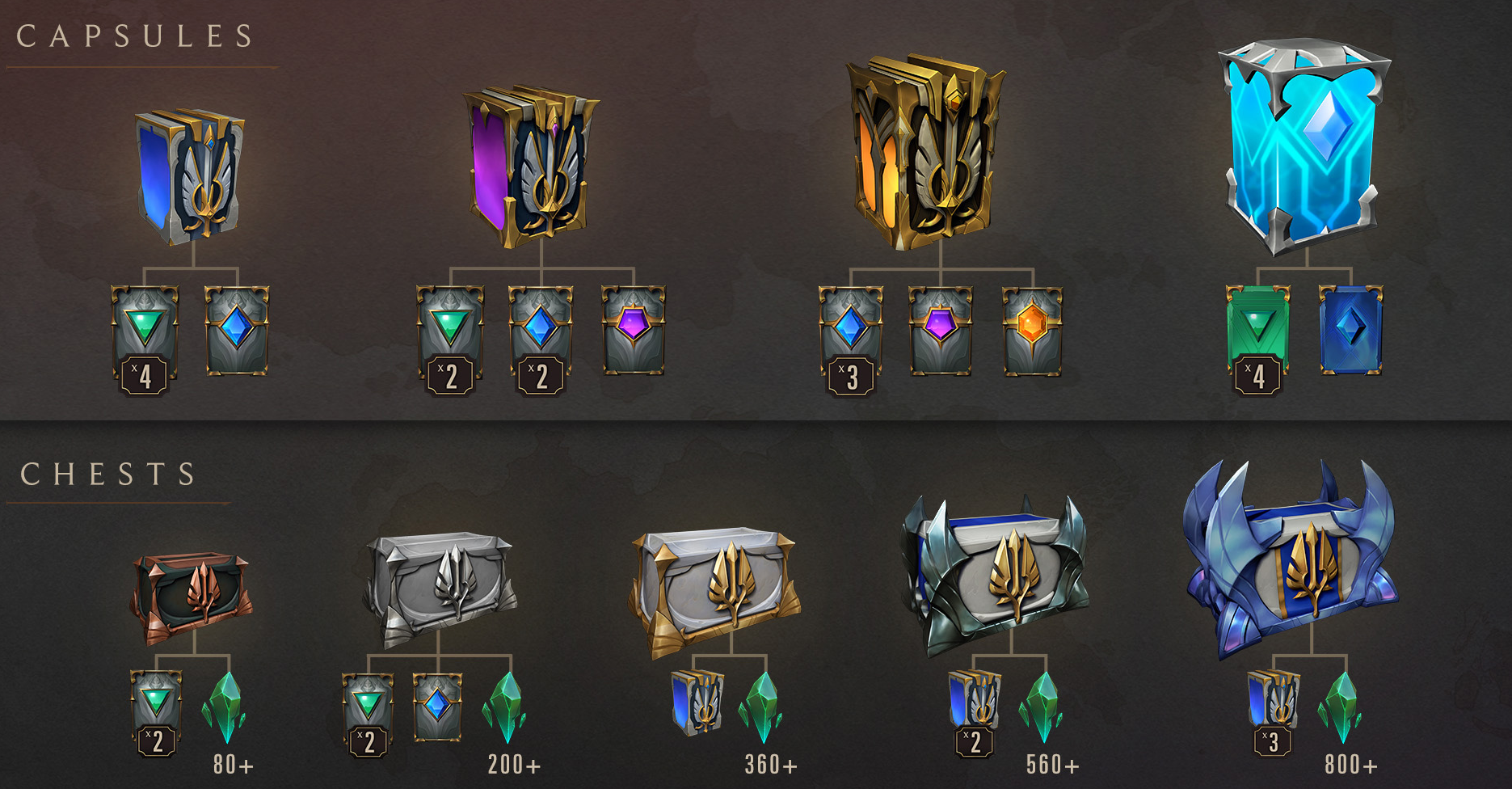 Získanými XP sa ti otvárajú nové karty formou rôznych truhličiek, wild kariet (niečo ako žolík, ktorého môžeš jednorazovo vymeniť za akúkoľvek kartu danej rarity) a shardov (črepinky, ktoré dostaneš, ak už máš novo získanú kartu tri krát, a môžeš si za nich kúpiť karty, ktoré ti chýbajú). Podľa rarity a hodnoty rozdeľujeme karty na common,