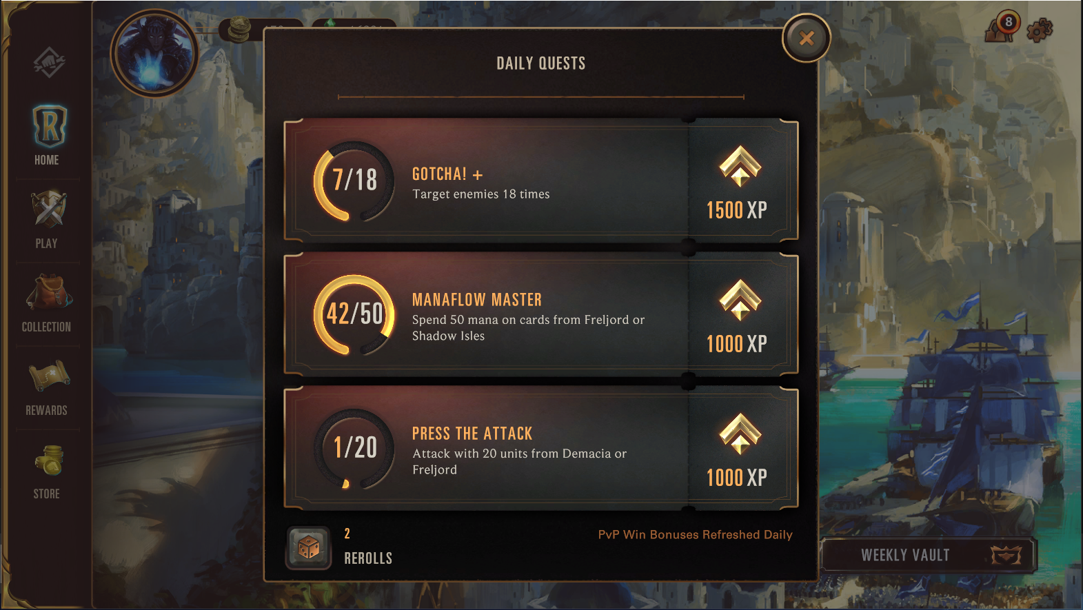 Ďalším zdrojom kariet je Weekly Vault, ktorý sa otvorí... prekvapivo, raz za týždeň😊 Výška odmeny záleží od dosiahnutého levelu. XP získavané hraním a plnením questov idú súbežne do levelovania zvoleného regiónu a týždenného trezoru, nedelia sa.