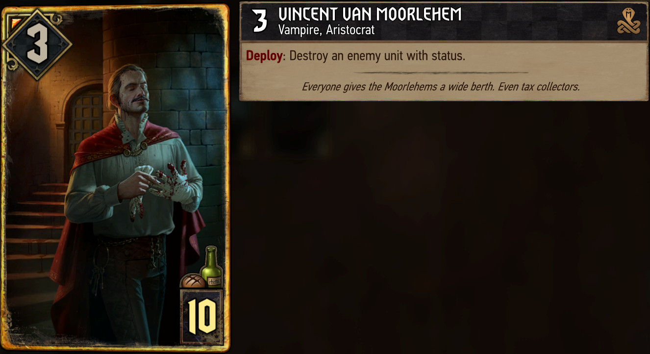 Vincent van Moorlehem je extrémně silná zlatá karta. Nejenže zničí jakoukoliv nepřátelskou jednotku se statusem, ale navíc má důležité označení Aristocrat, který aktivuje kartu Scenario.