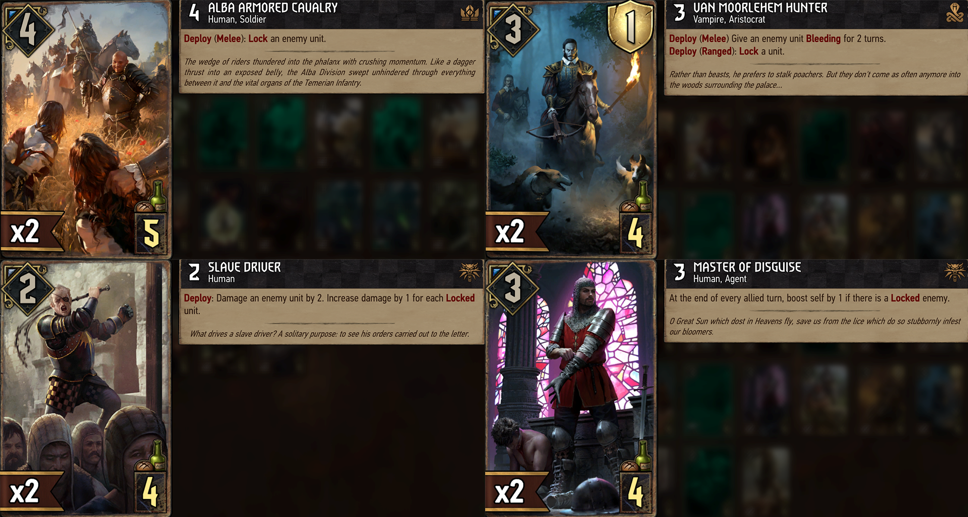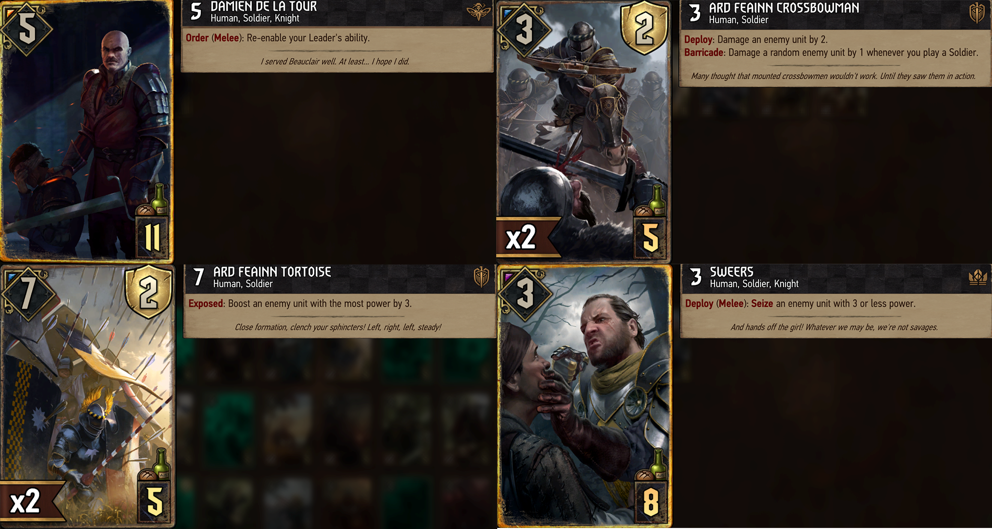 Damienův silný order ti umožní resetovat velitelskou schopnost. Je to velice nebezpečná jednotka, protože pokud dokáže přežít, zamíchá celou hrou. Ard Feainn Crosswobman při vyložení poškodí nepřátelskou jednotku za dva body. Pokud ale má Armor, při zahrání další karty Soldier poškodí náhodnou nepřátelskou jednotku o 1 bod. Ztratí-li Ard Feainn Tortoise svůj Armor, přidá nejvyšší nepřátelské jednotce 3 body. Tento nedostatek však nahrazuje větší silou za malý počet provizí. A pokud máš prostředky, jak odstranit největší jednotku nepřítele, stává se z této karty velice výhodná bronzová karta. Sweers se zmocní nepřátelské jednotky se silou 3 nebo méně. To se hodí v případě, kdy nemáš jak odstranit protivníkův engine nebo chceš získat důležitou protivníkovu kartu. (Tohle mňa na NF sere najvíc: ničit a blokovať karty je jedna věc, ale krást? To už je moc! )