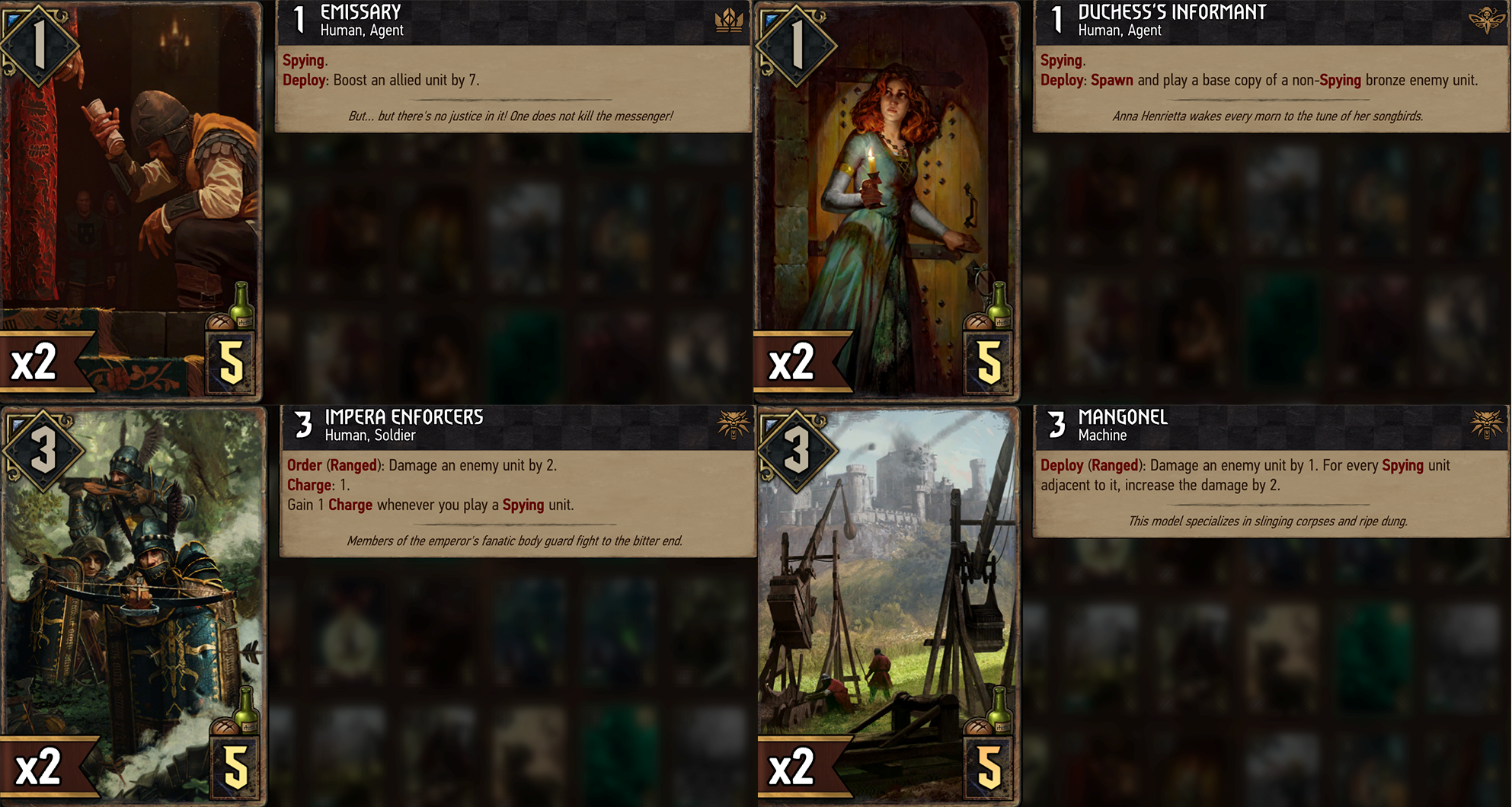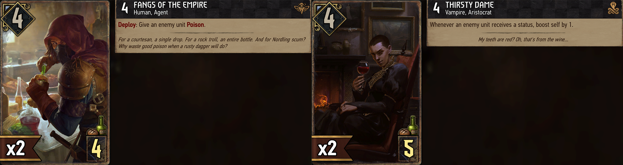Velice vhodná karta do tohoto archetypu a zároveň karta, kterou vytvoří naše karta Scenario, je karta Thirsty Dame. Tato jednotka funguje tak, že pokaždé, když nepřátelská jednotka obdrží jakýkoliv status - ať už negativní (otrava, krvácení), nebo pozitivní (štít, vitalita) - posílí se o 1. Je to silná bronzová karta, která má potenciál vysoce překonat svou cenu v provizích. Fangs of the Empire je nezbytná bronzová karta, která otráví nepřátelskou jednotku. (To je von! Ten hajzl špiclovjskej!)