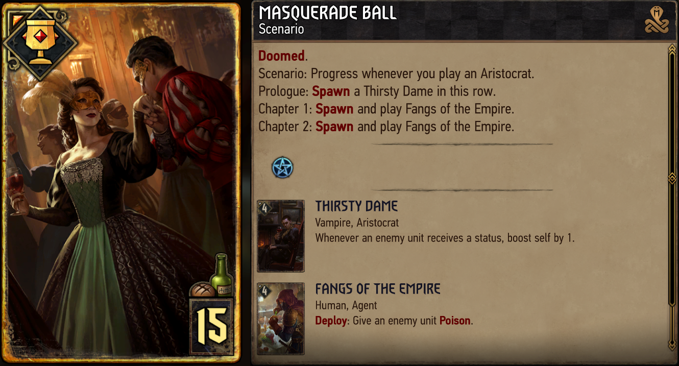 Když zahraješ tuto kartu (Prologue), automaticky se ve stejné řadě vytvoří karta Thirsty Dame. Když pak zahraješ kartu s označením Aristocrat (Chapter 1 + 2), vytvoříš a vyneseš kartu Fangs of the Empire. (Je fakt, že týmto aspoň oživili používání a ničení artefaktú.)