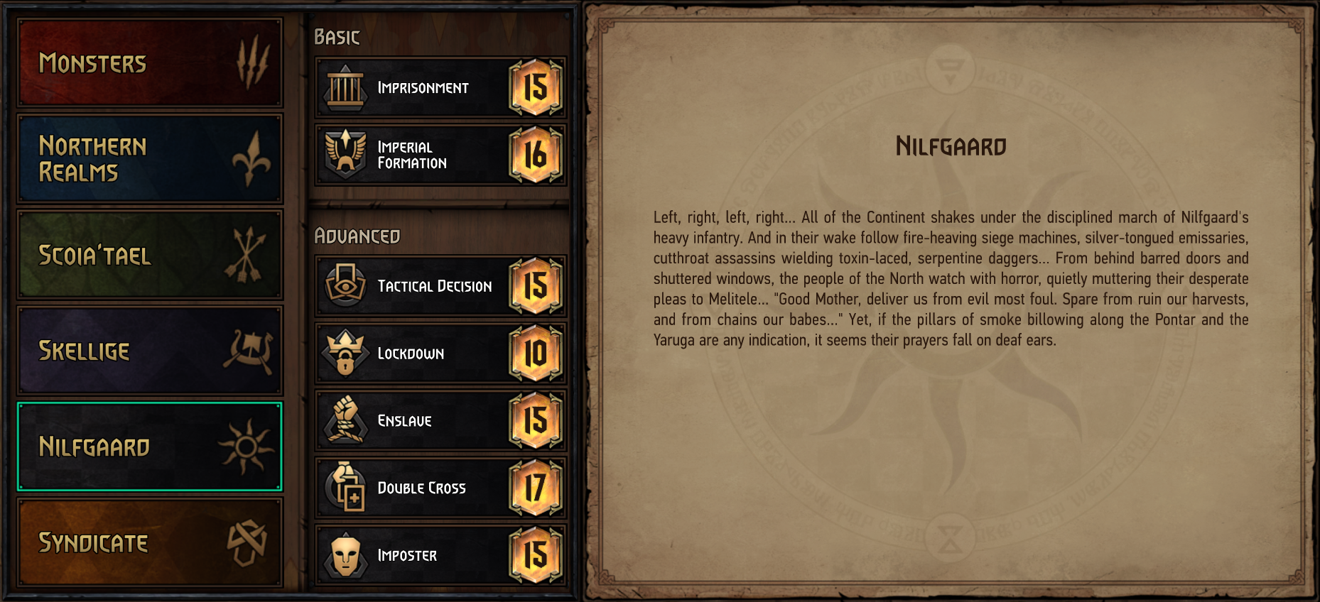 Zdravím, já jsem Firenand a dnes tě spolu s Yarpenem provedu další frakcí, kterou je mocné císařství Nilfgaard! (dále už jen jako “NF”) (Mocné možná, ale banda zkurvysynů!)