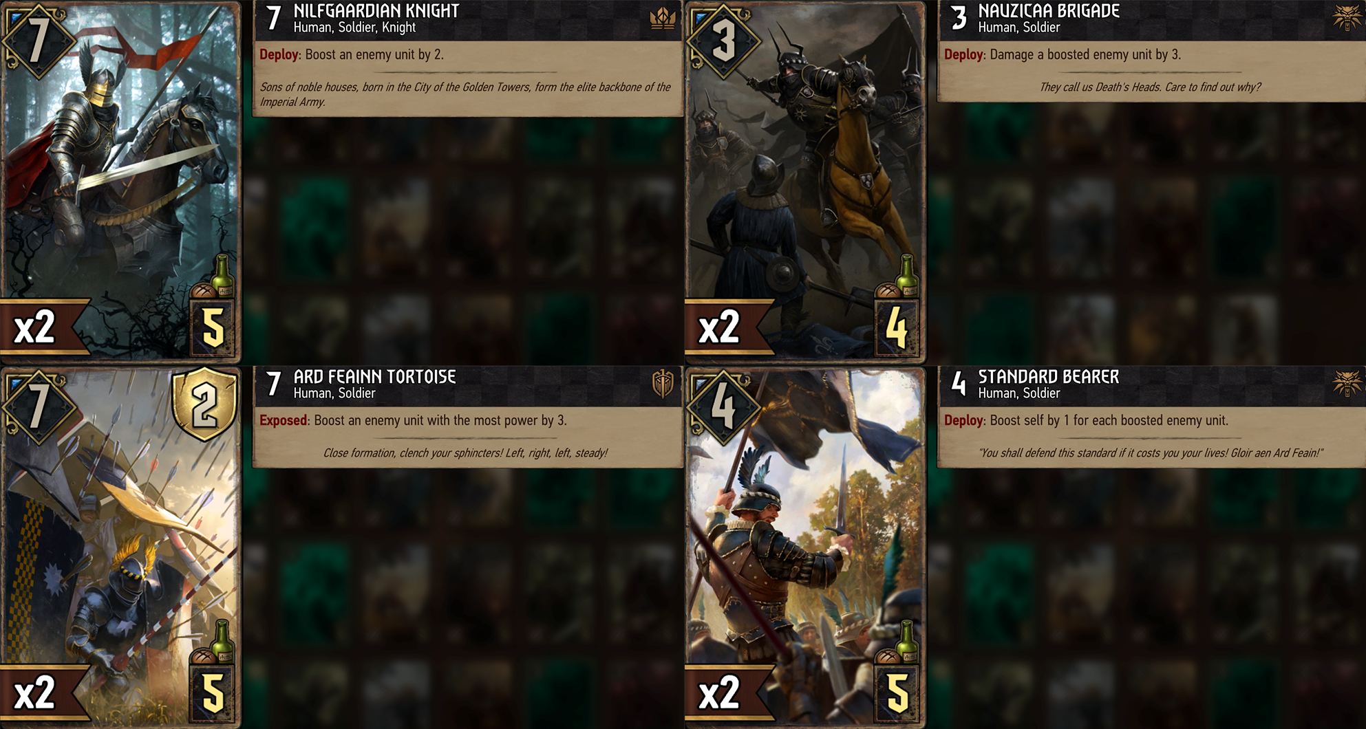 Tento archetyp logicky spolupracuje se schopností Imperial Formation. Většinou jsou to balíčky napěchované kartami Soldier, které se vzájemně doplňují. Nilfgaard má opravdu velkou zásobu takovýchto karet, takže je z čeho vybírat a balíčky Soldier jsou co do karet vcelku rozmanité.