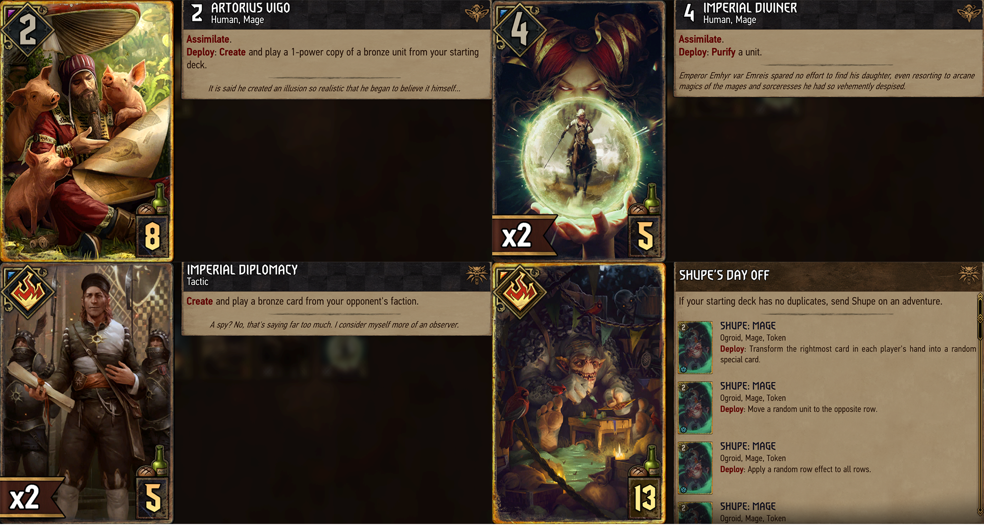 Artorius Vigo je jedna z nejsilnějších zlatých karet Assimilate, která má však navíc schopnost vytvořit další novou kartu a tím ještě více podpořit ostatní jednotky Assimilate na stole. Je to velice všestranná karta. (Šak sa naň ho pozri, jak sa bratruje s prasatama! Ako každý černý!) Imperial Diviner je bronzová karta Assimilate, která navíc dokáže očistit jednotky od statusů (hodí se zejména proti jedovým balíčkům NF). Imperial Diplomacy je taktická karta, která vytvoří a zahraje bronzovou jednotku z protivníkovy frakce. Tím samozřejmě podpoří vyložené karty Assimilate a zároveň máš šanci dostat nějakou silnou nebo situační bronzovou kartu. Pro zvýšení faktoru náhody, zábavy a znechucení protivníka doporučuju do balíčku přimíchat námi všemi oblíbenou neutrální kartu trolla Shupeho! Kromě náhodného efektu navíc každá jeho zahraná podoba přidá jednotkám Assimilate jeden bod. (A ty mňa chceš taky nasrať, co?)