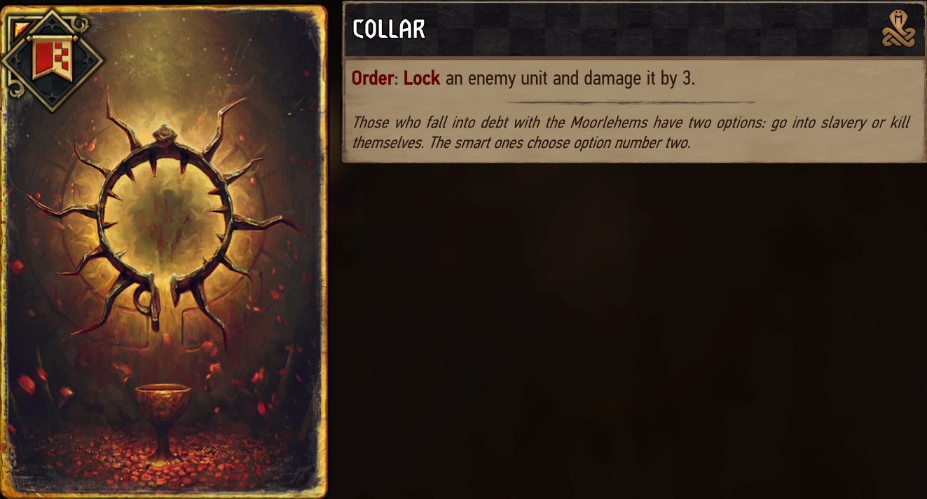 “Zamkni nepřátelskou jednotku, poté je vytvoř a zahraj na protější straně a posilni ji o 2” - Tato schopnost má zámek a zároveň “krádež” jednotky v jednom. Velice silná schopnost pro využití mnoha způsoby (Jasné zase krást a ještě zamykat… to by černým šlo!)